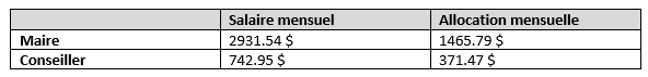 La rémunération des conseillers sera majorée de 1.8% et ajustée pour tenir compte des modifications à la Loi de l'impôt sur le revenu du Canada.  Les rémunérations mensuelles pour 2019 seront les suivantes: