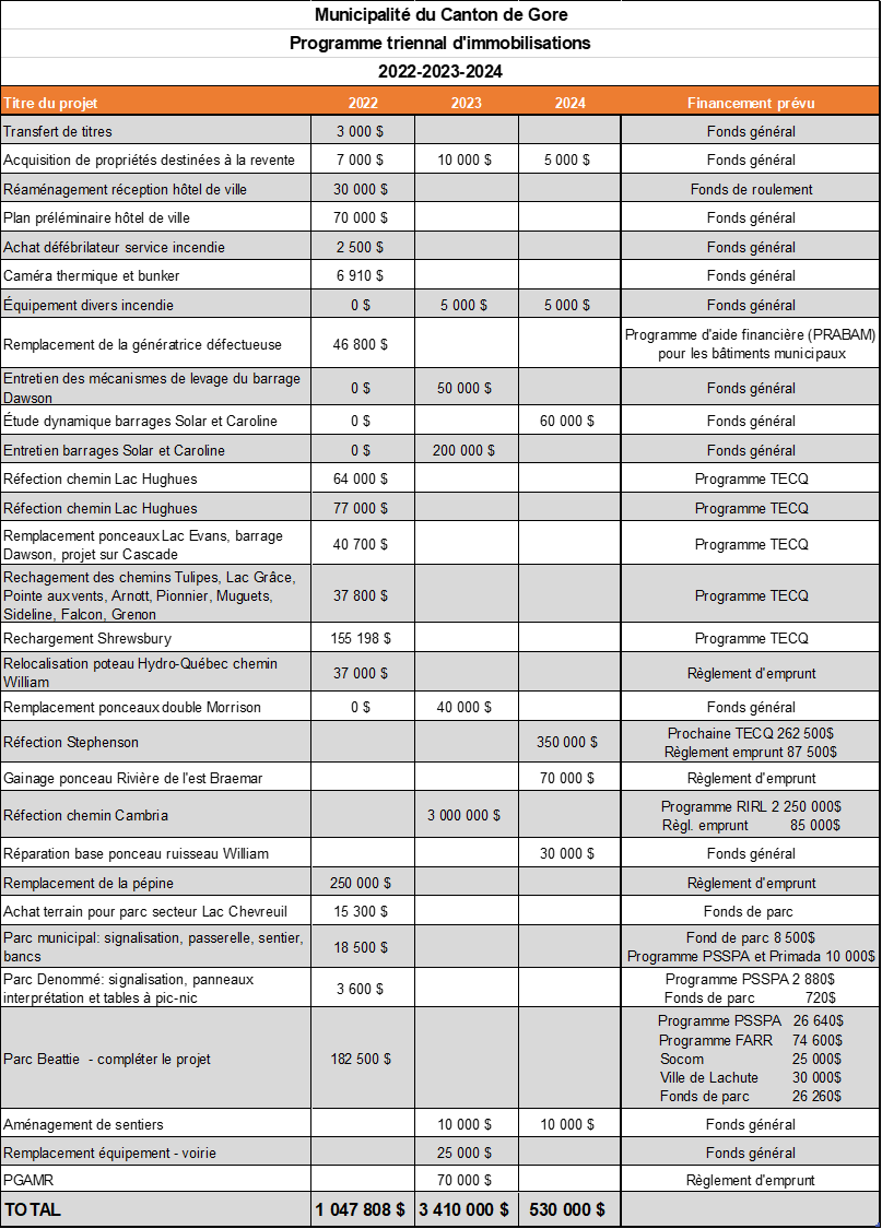 Le conseil adopte le budget de la Municipalité du Canton de Gore pour l’exercice financier de l’an 2025, prévoyant les revenus équivalant aux dépenses et se chiffrant comme suit :