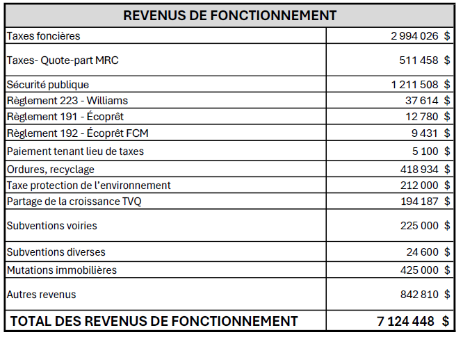 Le conseil autorise un budget de fonctionnement de 7 124 448 $ pour l’année à venir. Ce budget permettra de soutenir les services essentiels et les projets prioritaires de la municipalité.