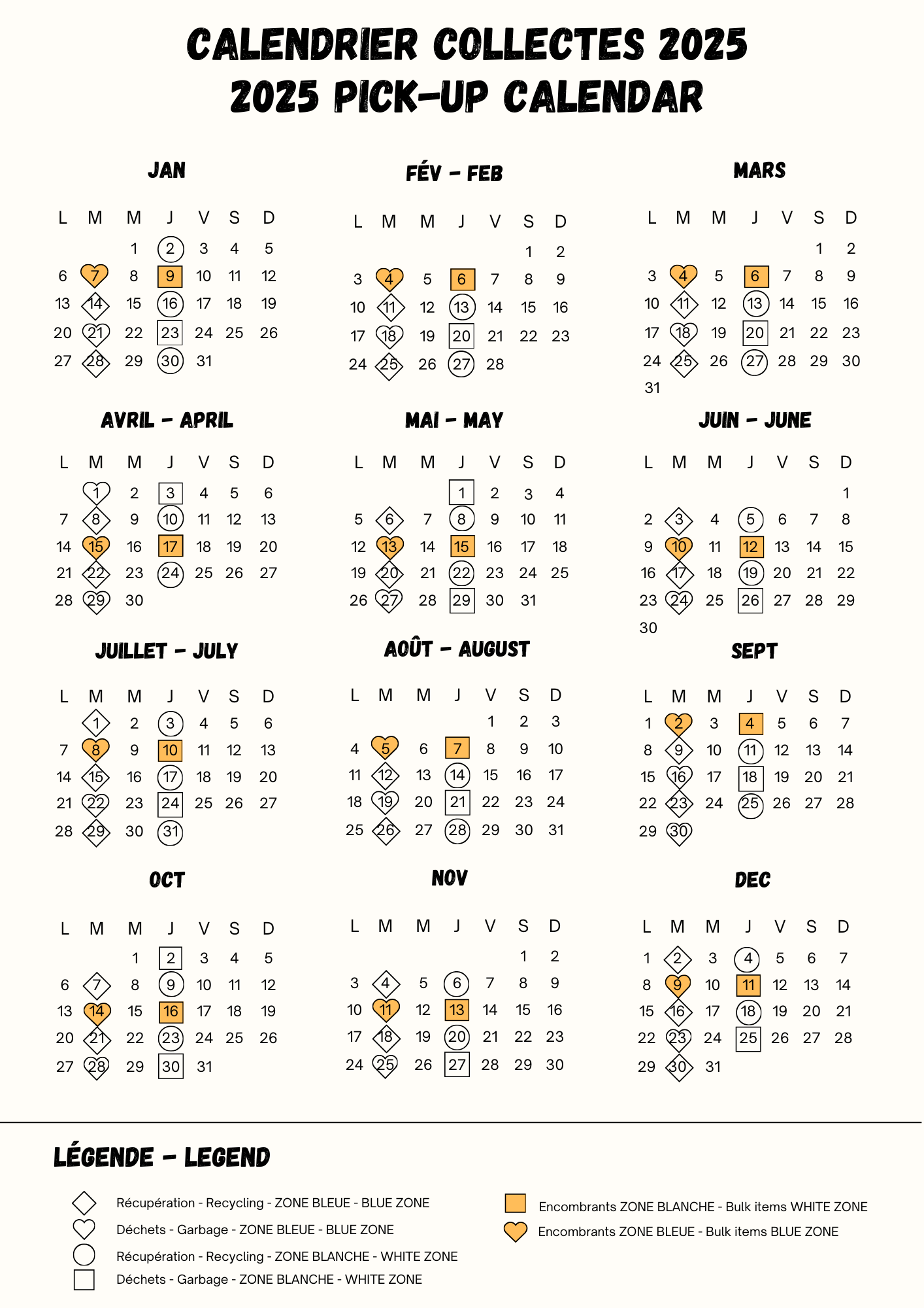 Calendrier 2025 des collectes selon la Zone :