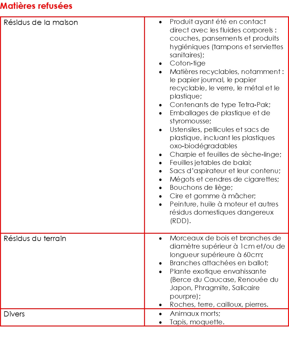 MATIÈRES REFUSÉES À L’ÉCOCENTRE